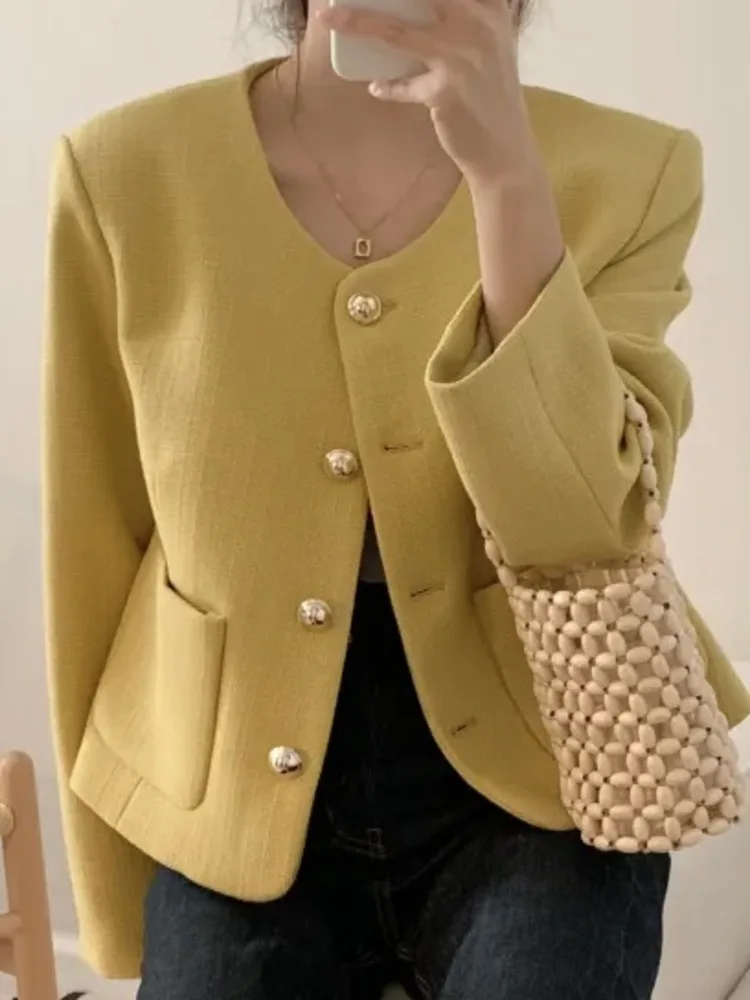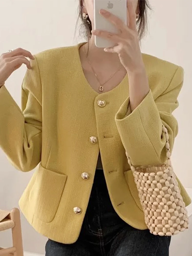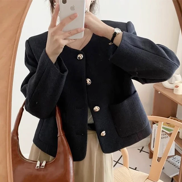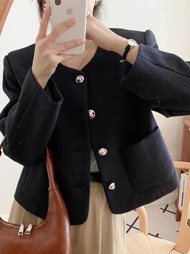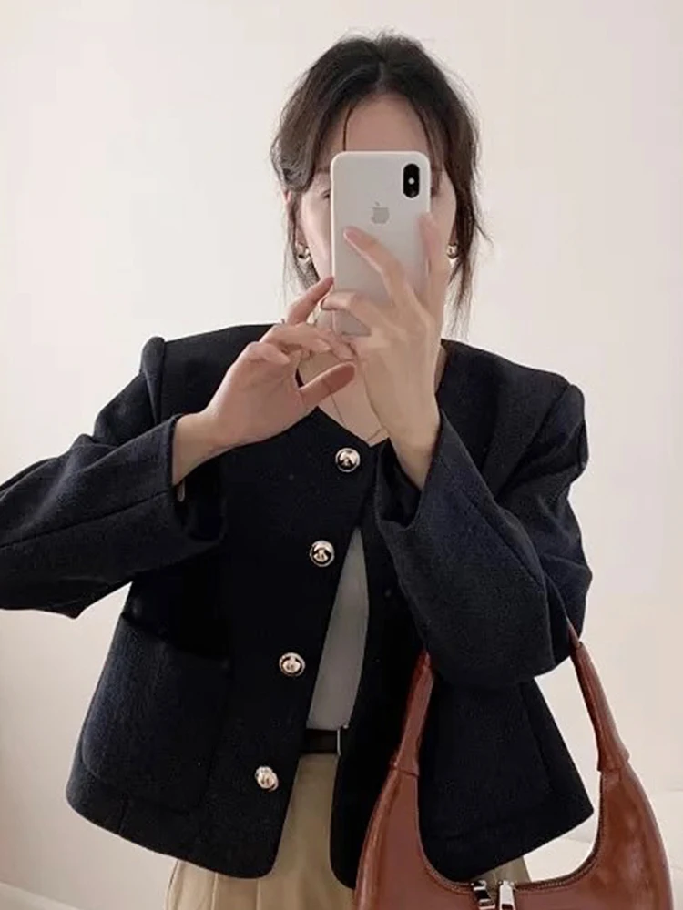 Chic Single Breasted Tweed Jacket For Women Long Sleeve Double Pocket Jackets Coat Autumn Winter New