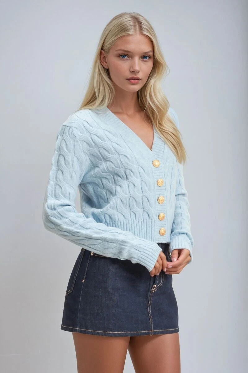- Design: Cable knit with gold button front and ribbed detailing