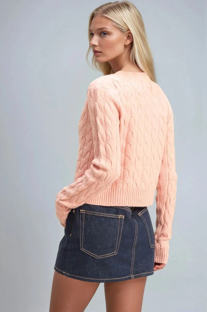 The [sbrand] Cable Knit Cardigan Sweater is a perfect blend of cozy comfort and modern style. Crafted from a textured cable knit, this sweater offers a warm, comfortable fit ideal for cooler weather. The V-neckline and cropped silhouette create a flattering, contemporary look, while the statement gold buttons down the front add a polished, elegant touch. The ribbed hem and cuffs provide structure and help retain the shape of the sweater, making it a versatile piece for layering or wearing on its own.