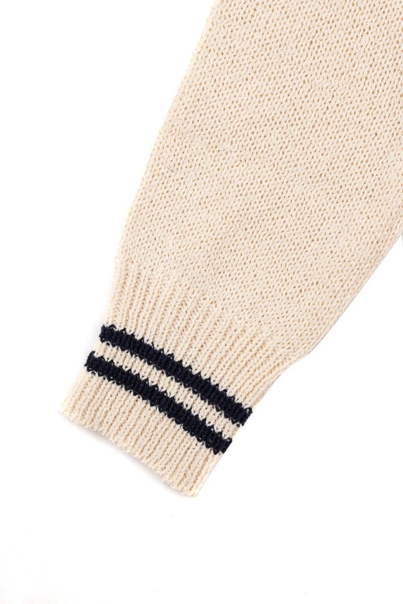 - Design: V-neckline with basic collar and contrast-stripe trim at the collar, hem, and cuffs