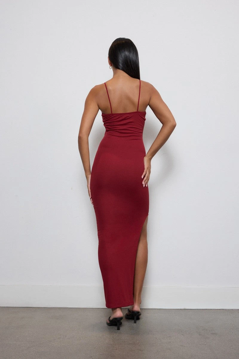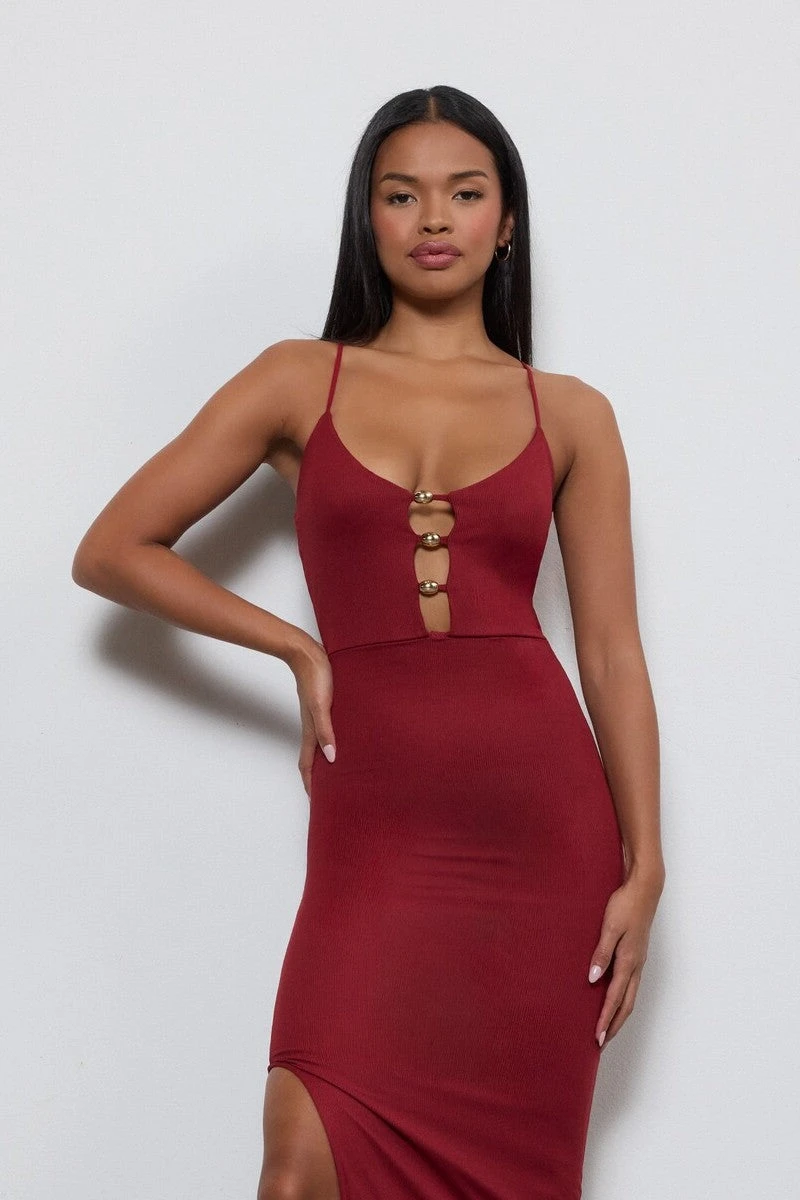 - Sleek fitted maxi dress with front cutout detailing for a bold, modern look