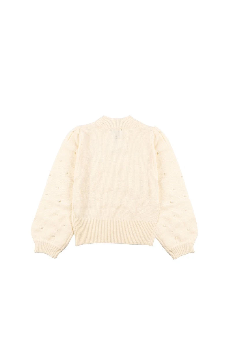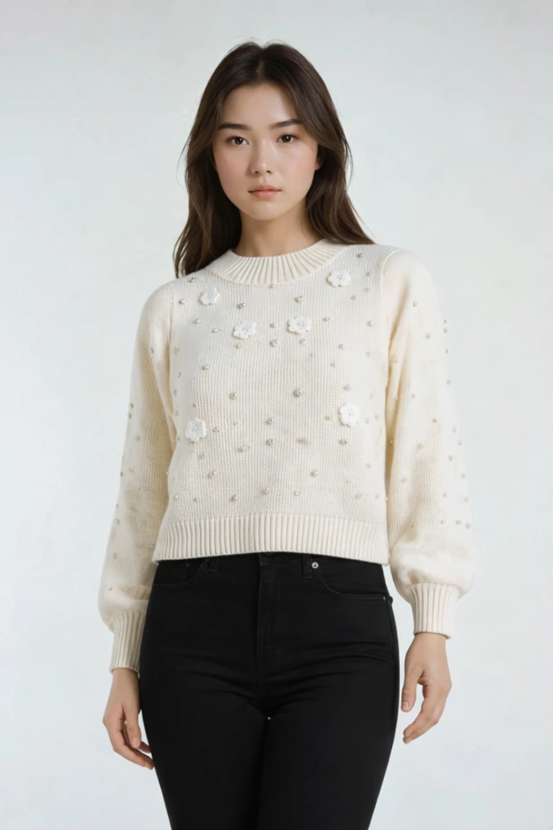 - Design: Knit sweater with floral appliqués, faux pearl accents, crew neckline, and ribbed trim