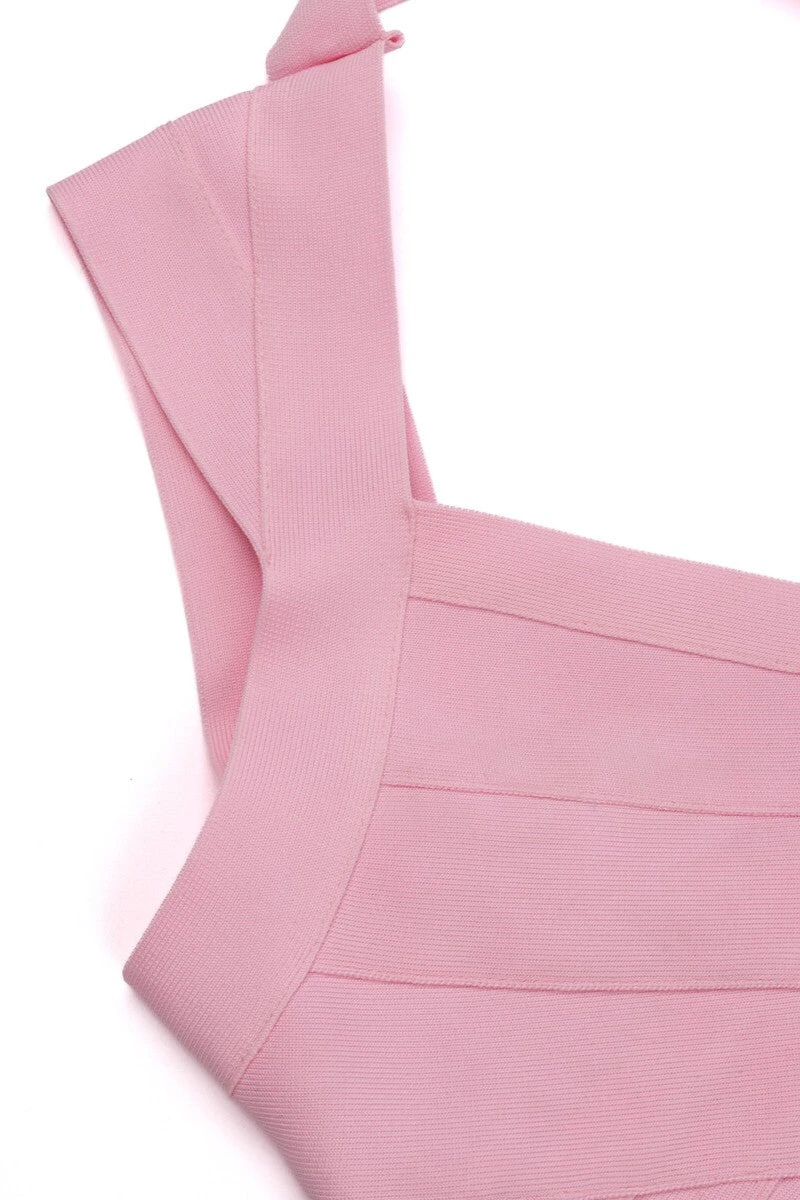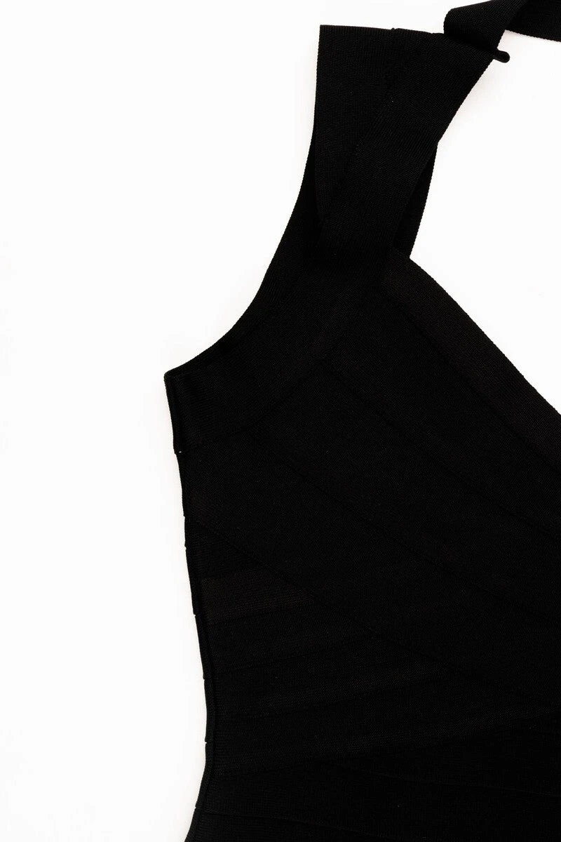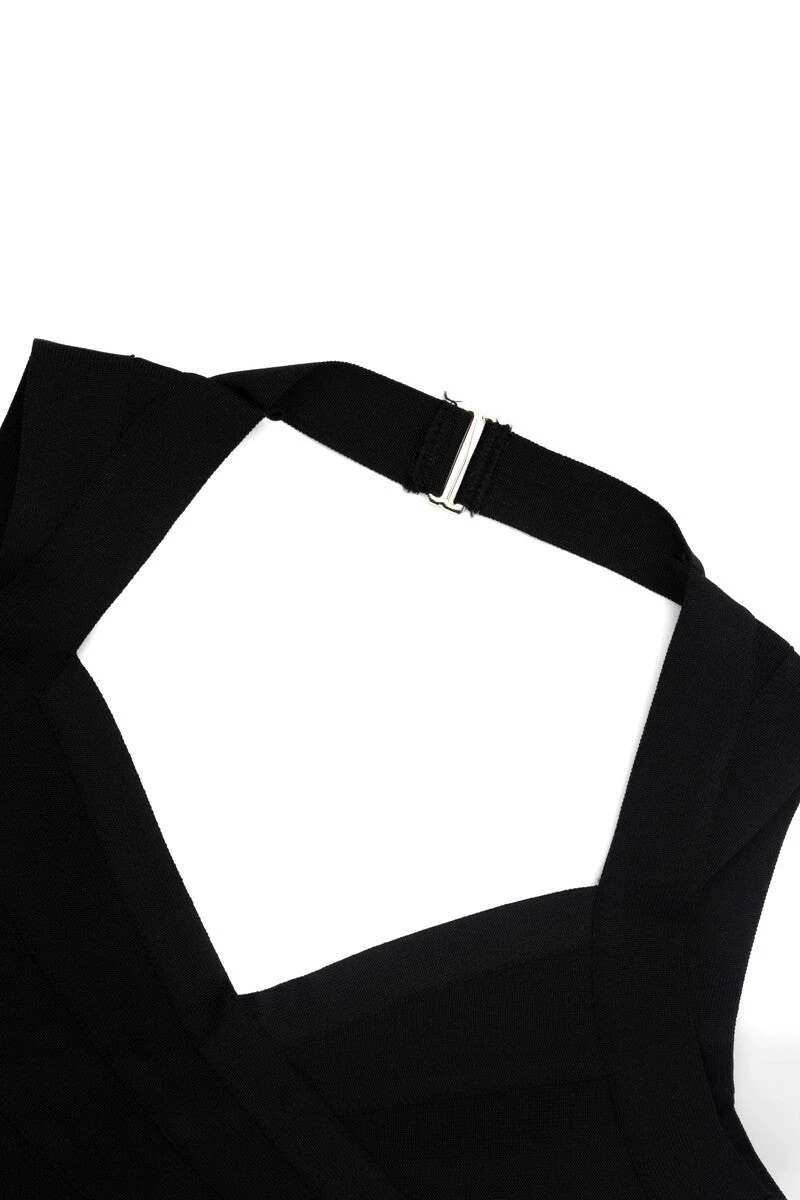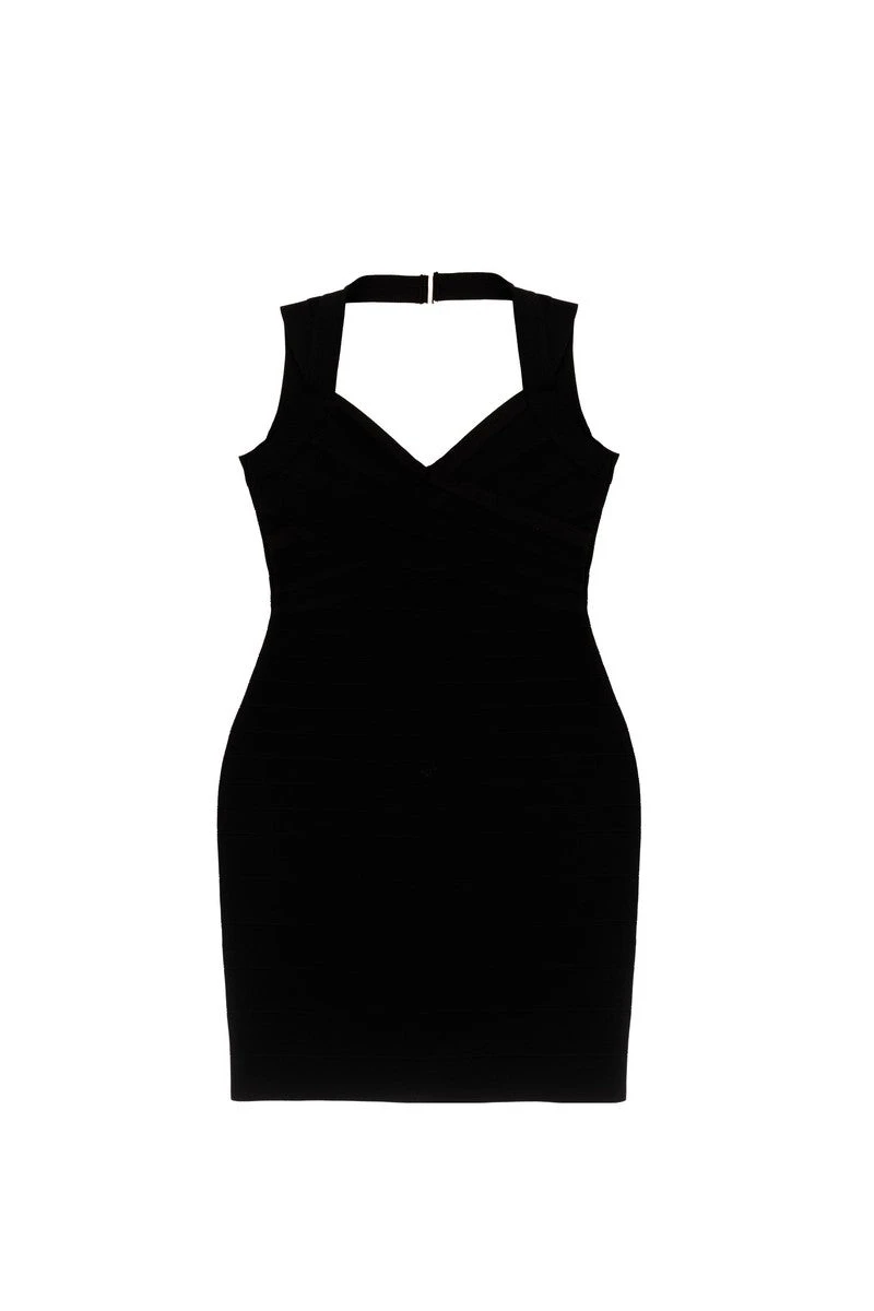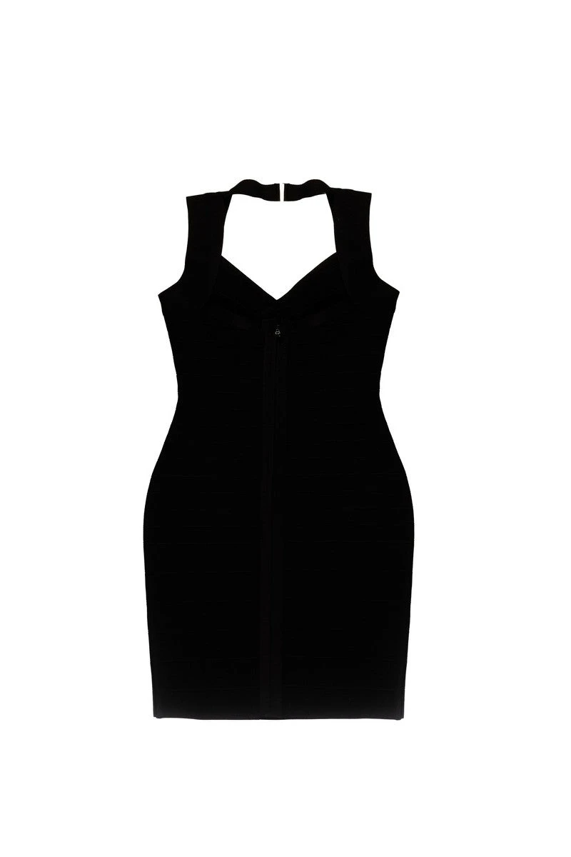 This style helps solve the challenge of finding a dress that creates a defined, sculpted shape while still offering flexibility and comfort. The stretchy bandage knit fabric hugs the body closely, the crossover detailing adds visual structure through the bodice, and the halter-style straps help create a secure and confident fit. The mini length also adds a bold, modern finish.