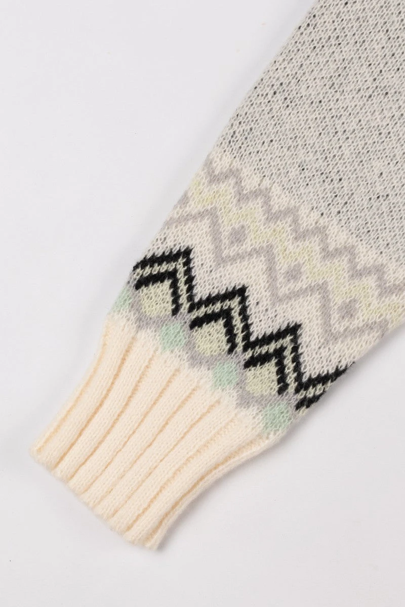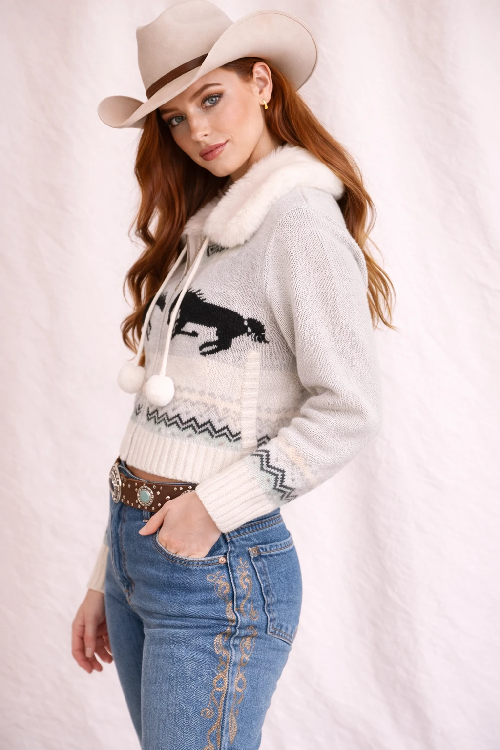 - Design: Zip-up knit sweater with horse motifs, Fair Isle-inspired pattern, faux-fur collar, pom-tie accents, and ribbed hem and cuffs