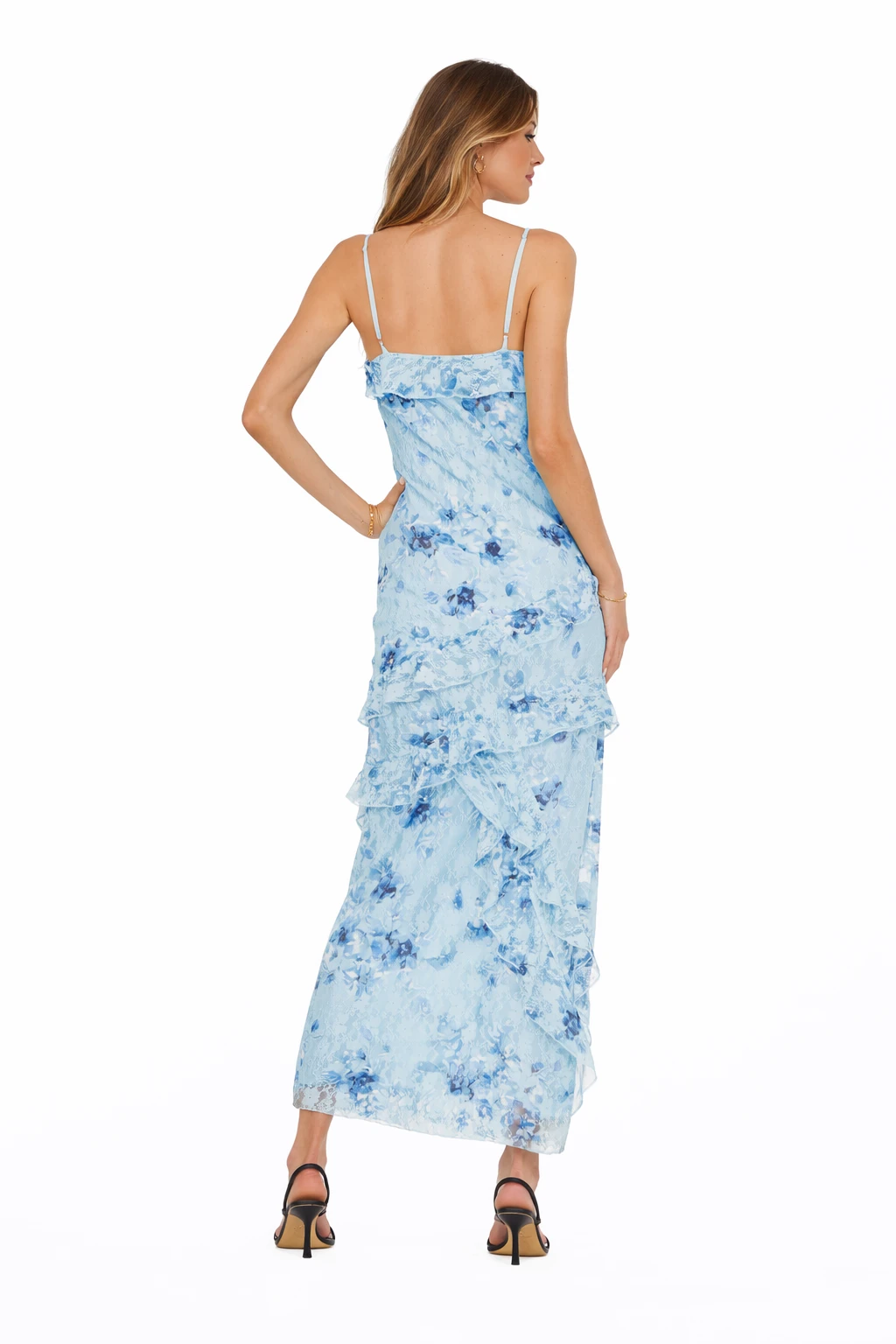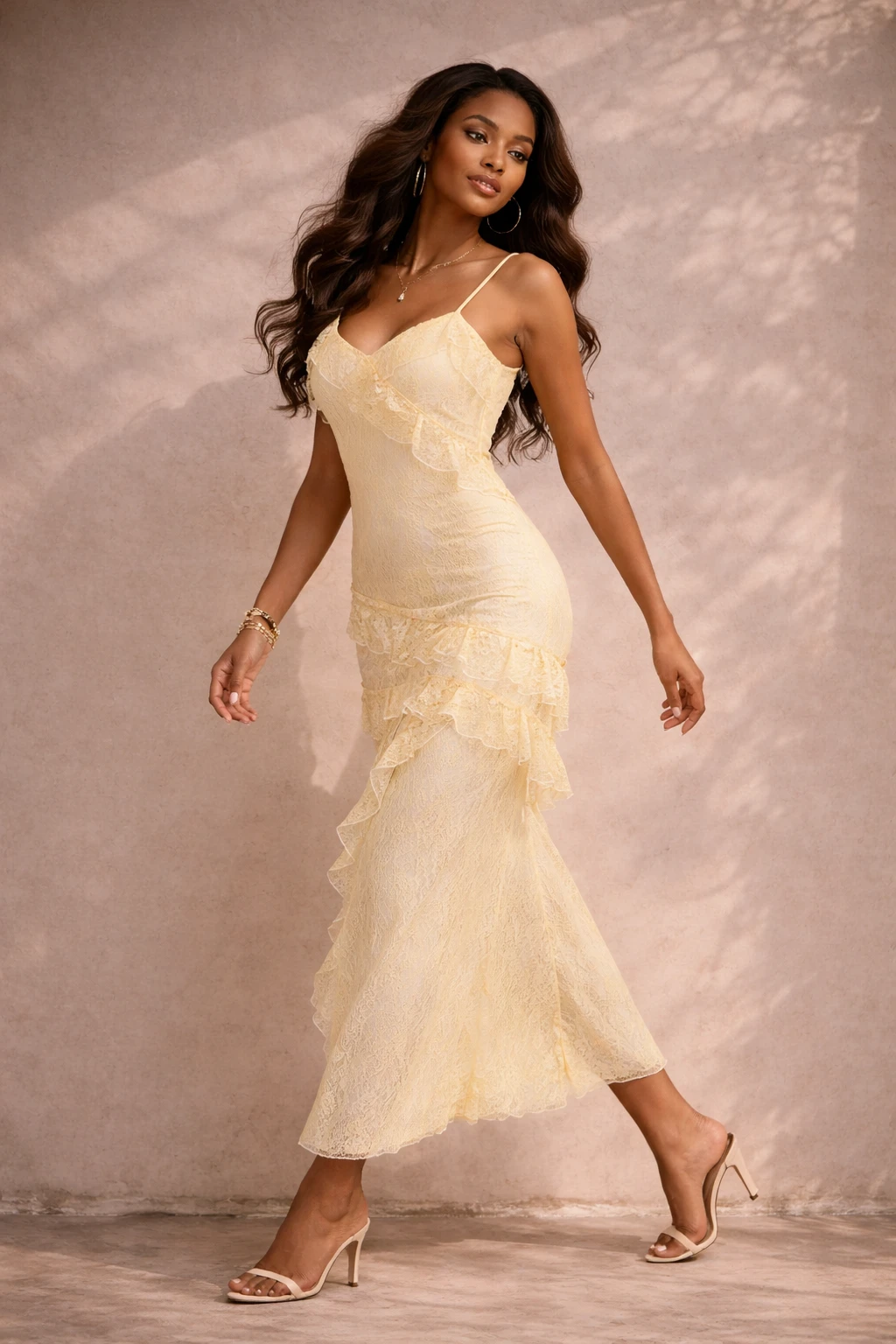 This style helps solve the challenge of finding a dress that feels dressy yet still soft and wearable. The floral lace overlay adds texture and elegance, the V-neckline creates a flattering shape, and the adjustable spaghetti straps allow for a more personalized fit. The cascading ruffles and flowing length also bring natural movement, helping the overall look feel light, graceful, and visually elevated.