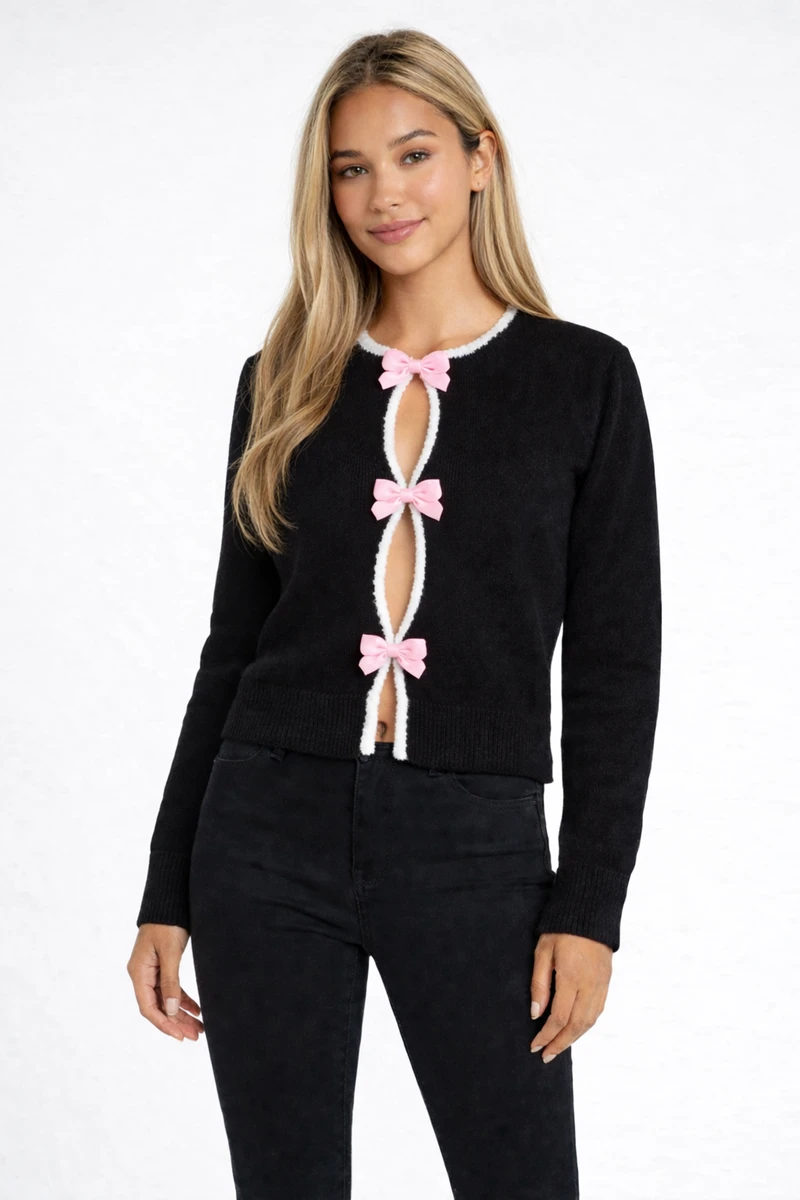 The [sbrand] Velvet Bow Open-Front Knit Sweater is a stylish and elegant piece designed to add a touch of sophistication to your wardrobe. Featuring a round neckline with scalloped contrast trim, this sweater offers a refined and polished look. The long sleeves with ribbed cuffs provide warmth and comfort, while the front cutout detail, accented with velvet bow closures, creates a unique and feminine touch. Made from a soft knit fabric, this sweater has a slightly cropped length with a ribbed hem, making it perfect for pairing with high-waisted pants or skirts.