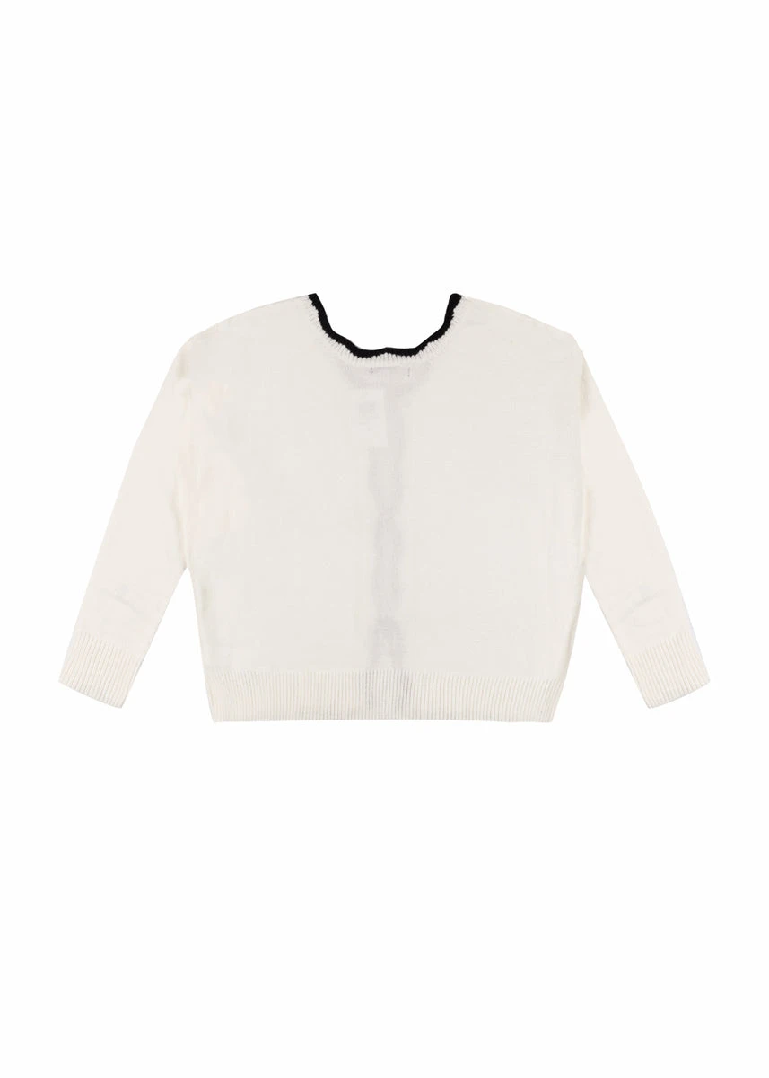 - The velvet bow closures and scalloped trim add unique details that elevate the classic sweater design.