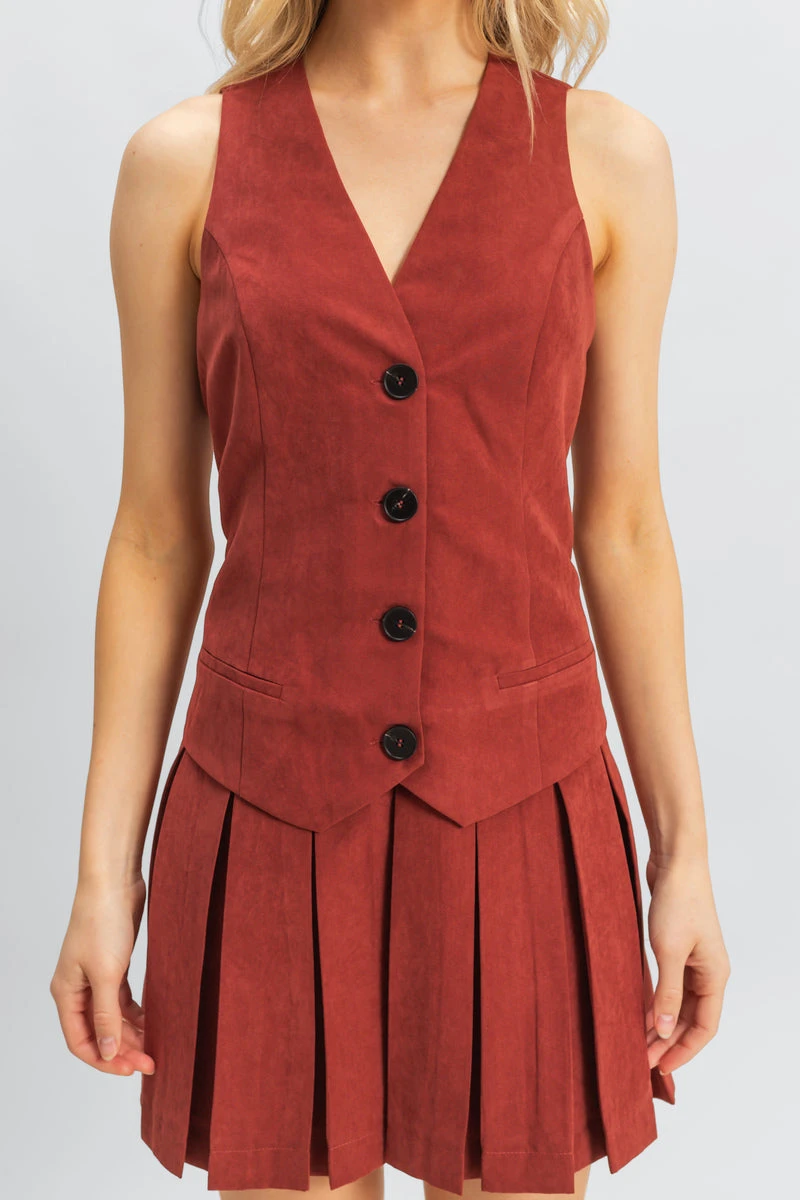 - Design: Sleeveless vest-style bodice, button-front closures, pleated skirt