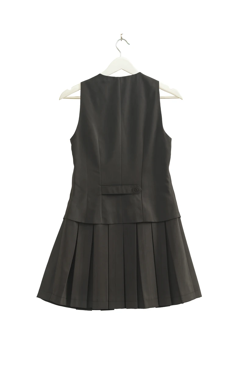 This dress solves the challenge of balancing structured design with feminine movement. The sleeveless vest-style bodice and button-front closures give it a tailored, modern appeal, while the pleated skirt ensures a flattering, flowing fit. The fit-and-flare silhouette accentuates the waist and creates an elegant, playful look that suits various body types.