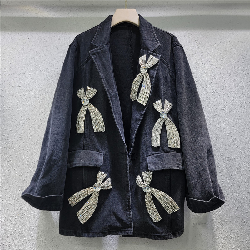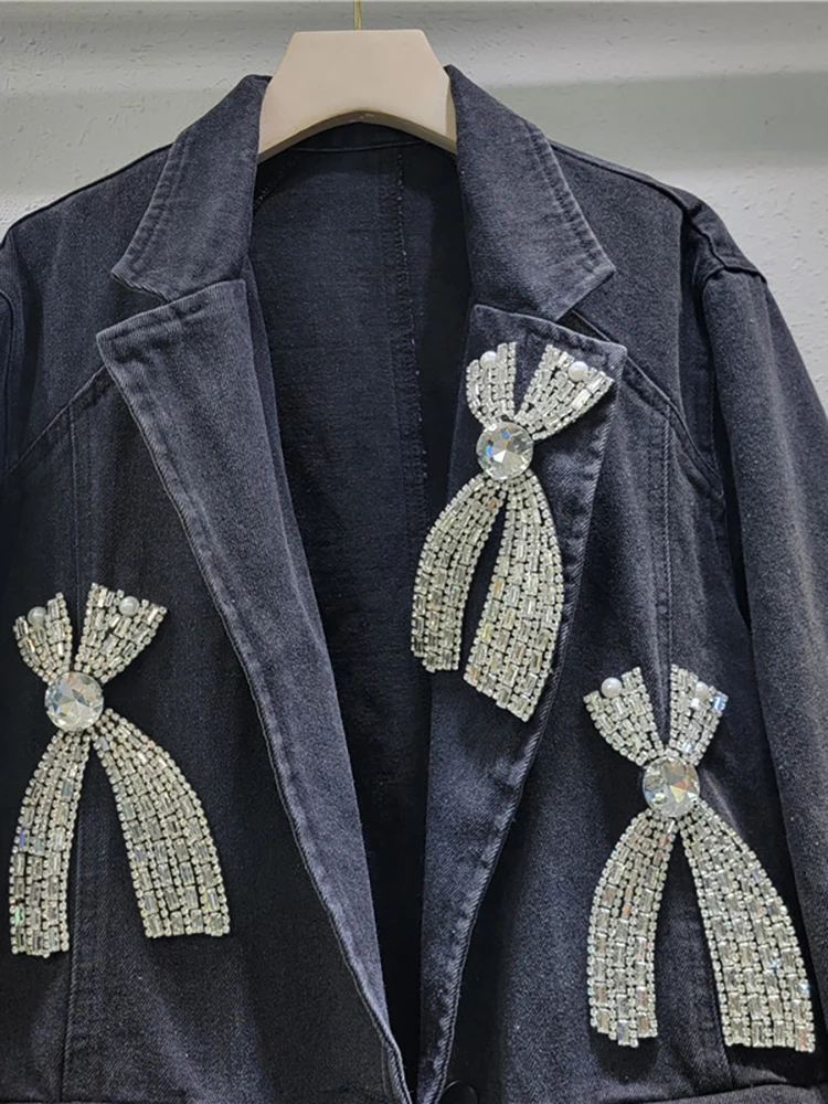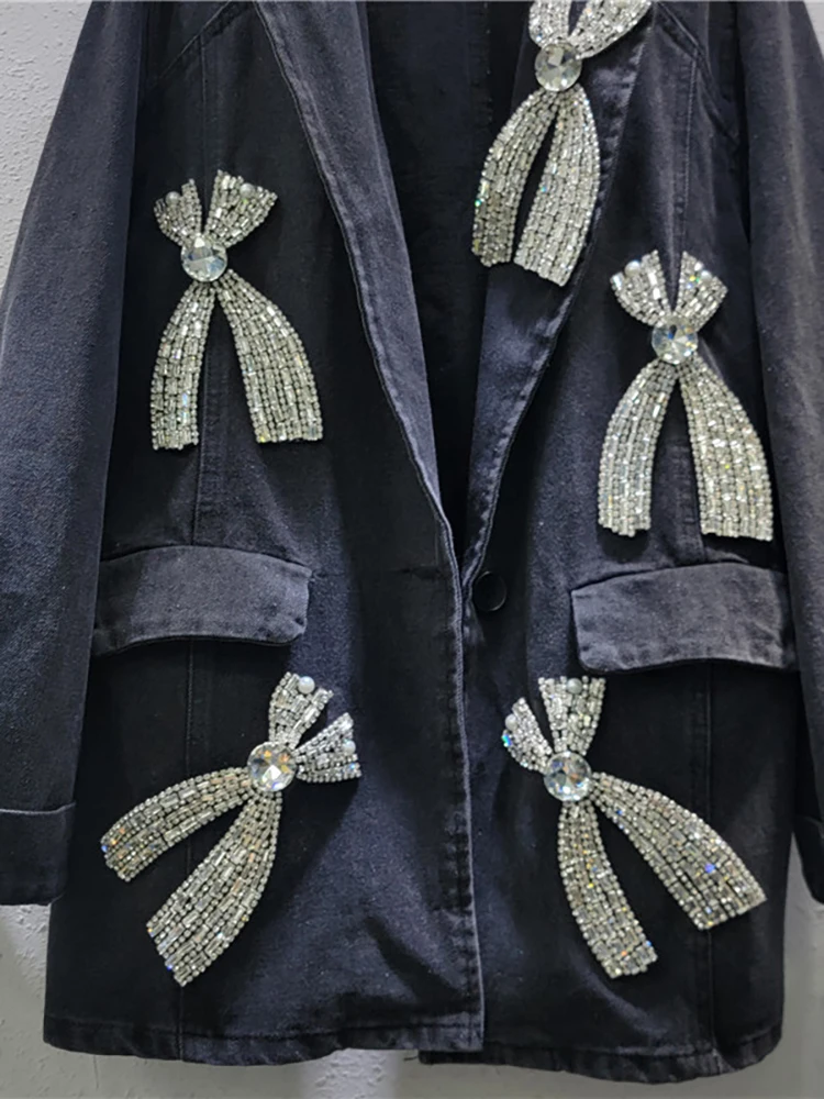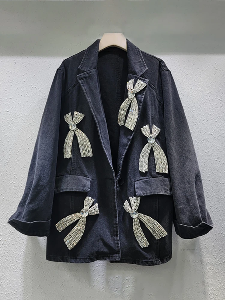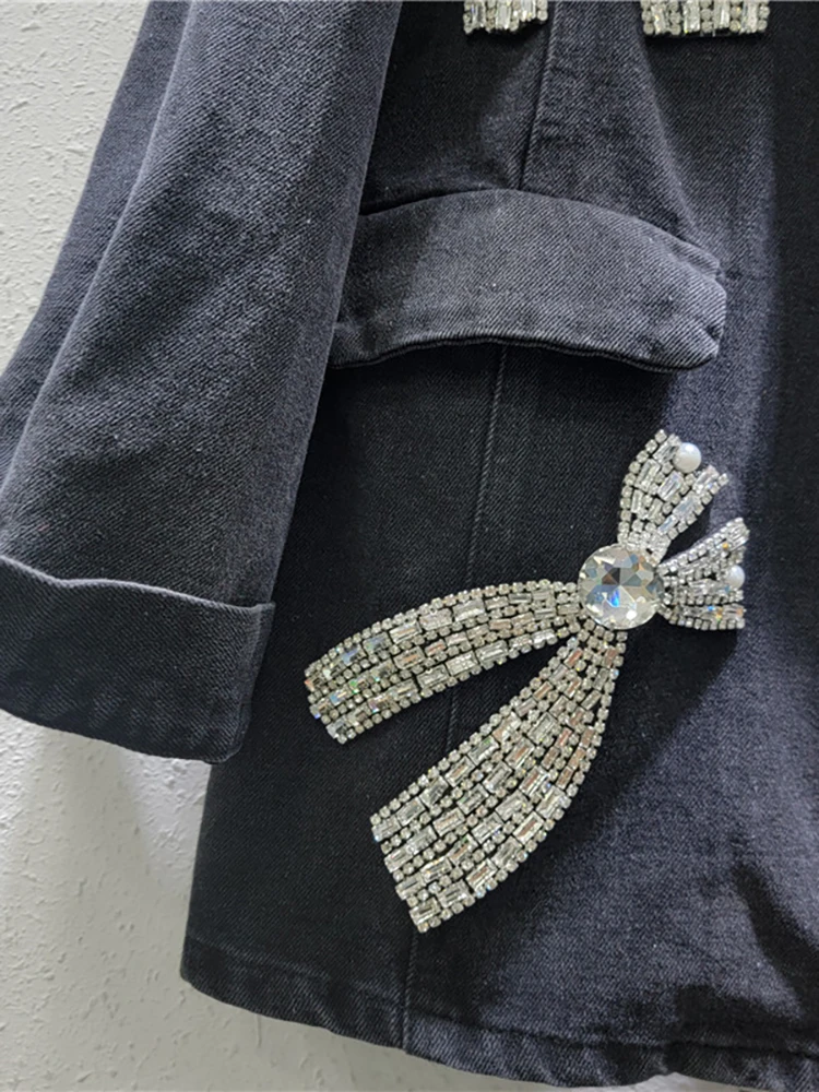 Women’s Denim Blazer Big Diamonds Bows Decoration Single Buttons Washed Black Suit Jackets