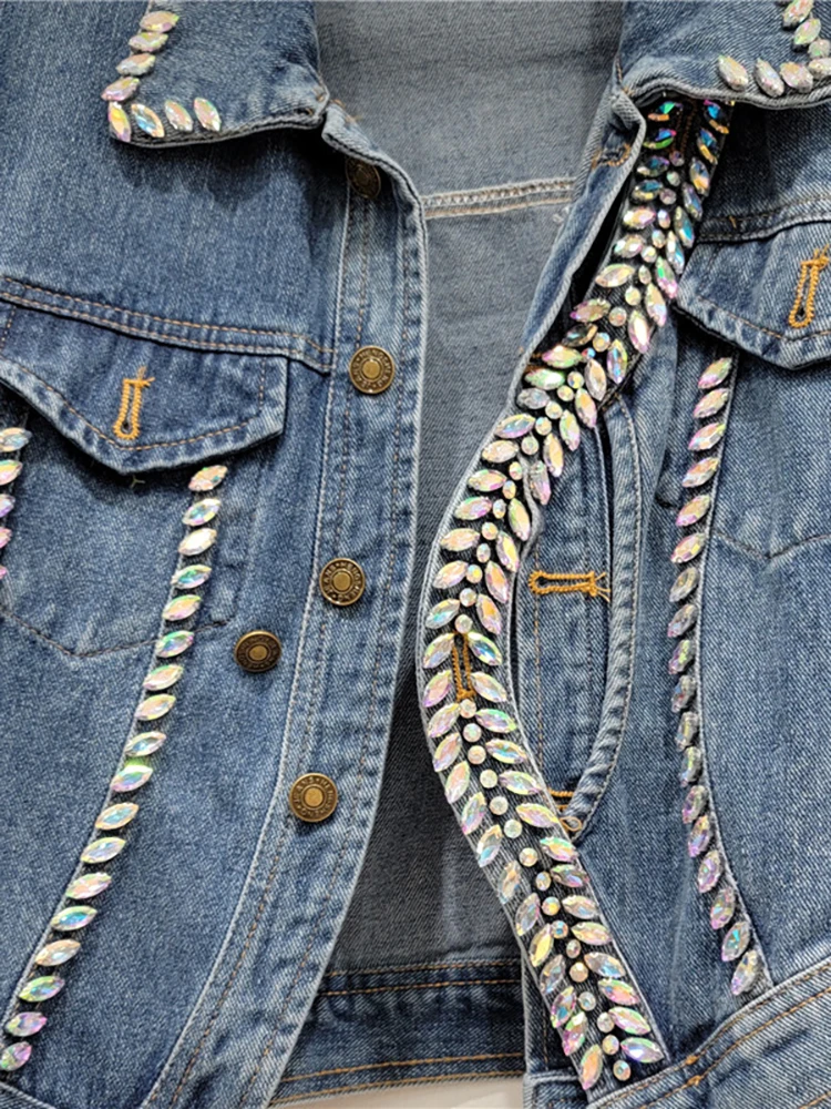 Women’s Denim Coats Splicing Asymmetry Crystal Diamonds Single Breasted Female Jackets